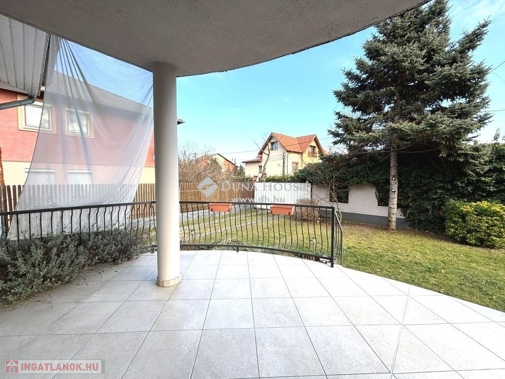 A füvesített, automata öntözőrendszerrel kiépített udvar bokrokkal, örökzöldekkel és egy fenyővel tarkított kellemes hangulatú hely, ahova a széles 22 nm-es földszinti terasz, illetve az emeleten található 14 nm-es erkély nyílik.