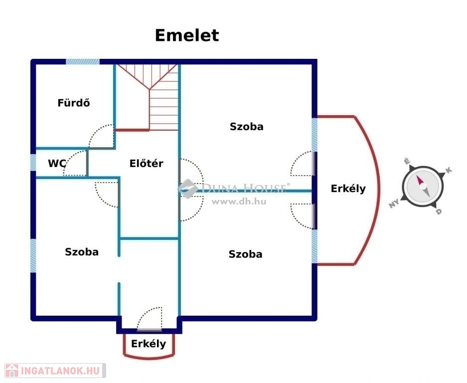 Kényelmes magasságú, széles lépcsőn juthatunk fel az emeleti közlekedőbe, innen léphetünk be mindhárom hálószobába, amelyekhez erkély is tartozik. Továbbá itt az emeleti fürdőszobában kényelmes méretű kád található, wc szintén külön helyiségben.