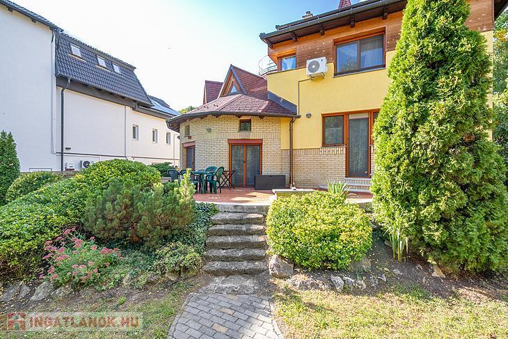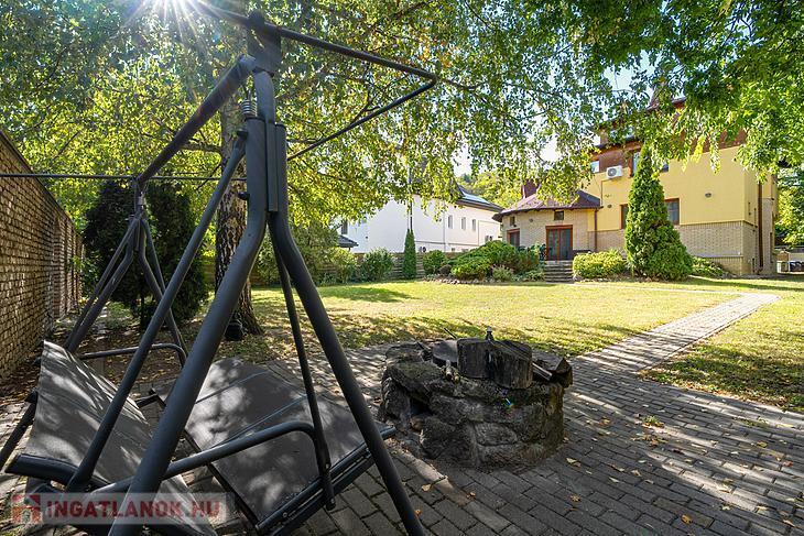 A kert és az udvar külön figyelmet érdemel: 2015-ben teljesen megújult, dísznövényekkel, amerikai tulipánfával, japán birssel, sziklakerttel és automata öntözőrendszerrel felszerelve. A hátsó udvar csendes, intim részében grillező és tűzrakóhely került kialakításra, beton térkő sétánnyal – a baráti összejövetelek kedvenc helyszíne lehet. A gyep alá vakondháló került, így mindig rendezett, zöld környezet várja az új tulajdonosokat.