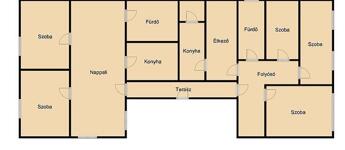A ház elosztása 5 szobából, 1 félszobából, konyhából és fürdőszobából áll.