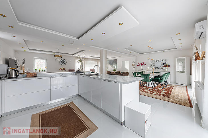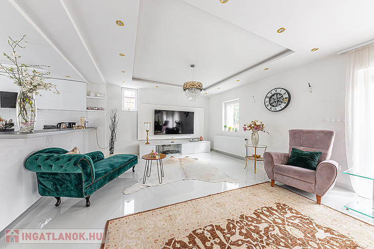 Az ingatlan elosztása kiváló, az alsó részen egy hatalmas nappali található, konyhával és étkezővel, a felső szinten pedig két szoba és egy tágas fürdőszoba lett kialakítva.