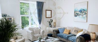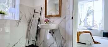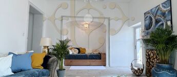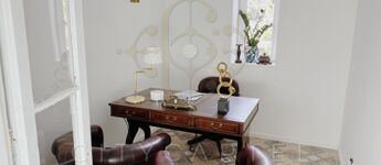 Az épület fehér falai, zöld zsalugáterei és díszes kovácsoltvas részletei mind a Provence-i stílus jellegzetes elemei, a természetes anyagok, a világos színválasztás pedig rusztikus eleganciát kölcsönöz.