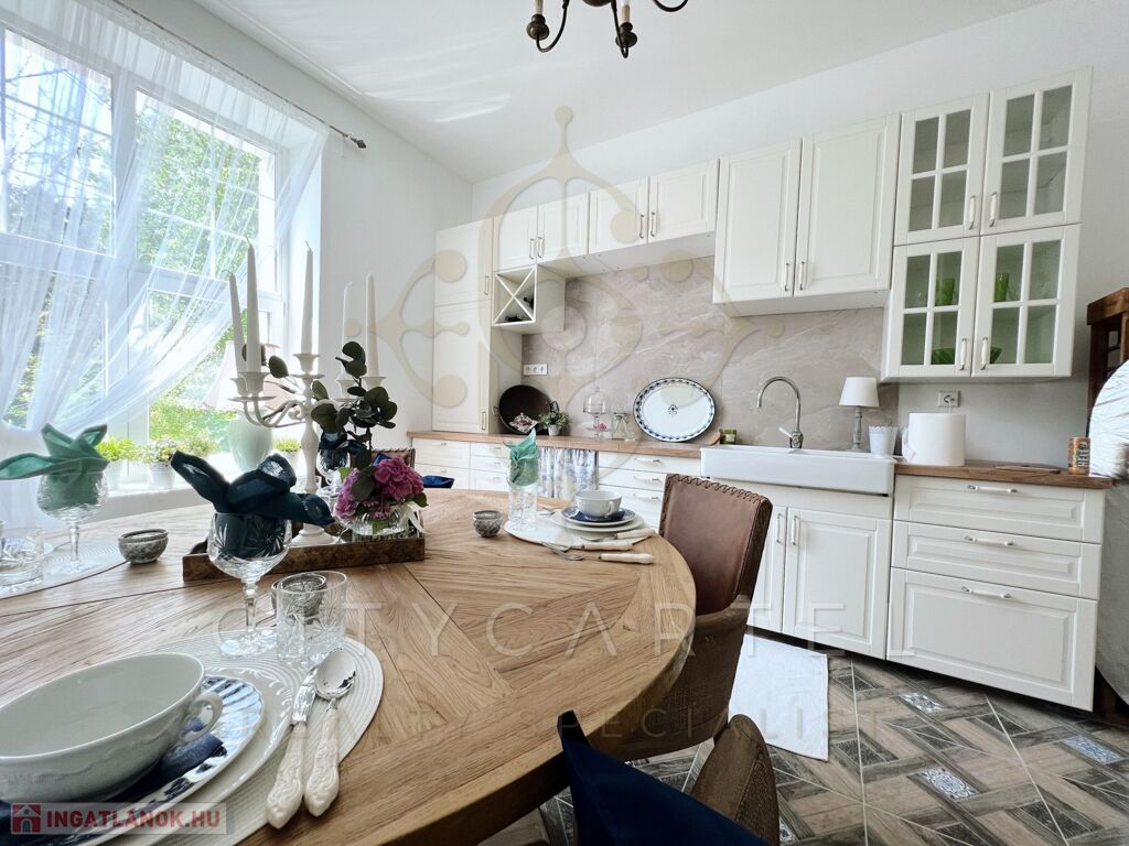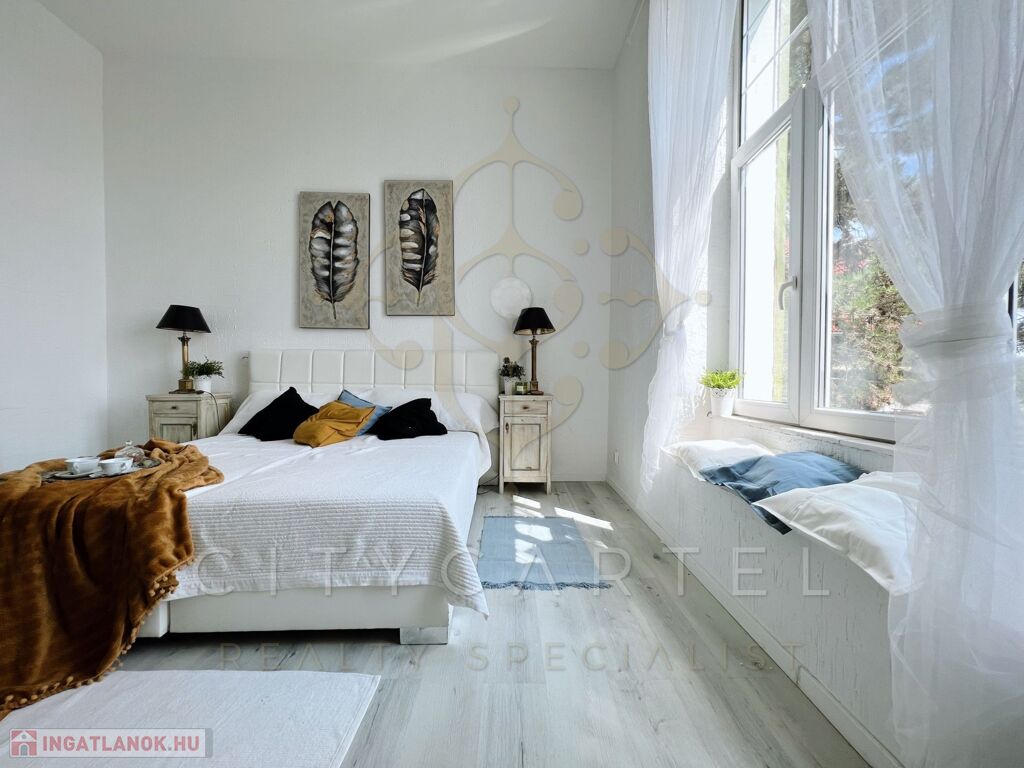 Az emeleten található egy kétszintes, étkező-konyha + 6 szobás (alsó szinten panorámás nappali nagy ablakokkal, 3,5 m belmagassággal, 2 szoba, fürdőszoba, vendégfürdő, mosókonyha – felső szinten 3 szoba, 2 fürdőszoba) vintage hangulatú lakosztály, amelynek legfelső emelete akár még tovább szeparálható. A tetőtér vörösfenyő gerendázatú, 25 cm paplan szigeteléssel biztosítja a kellemes klímát.