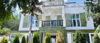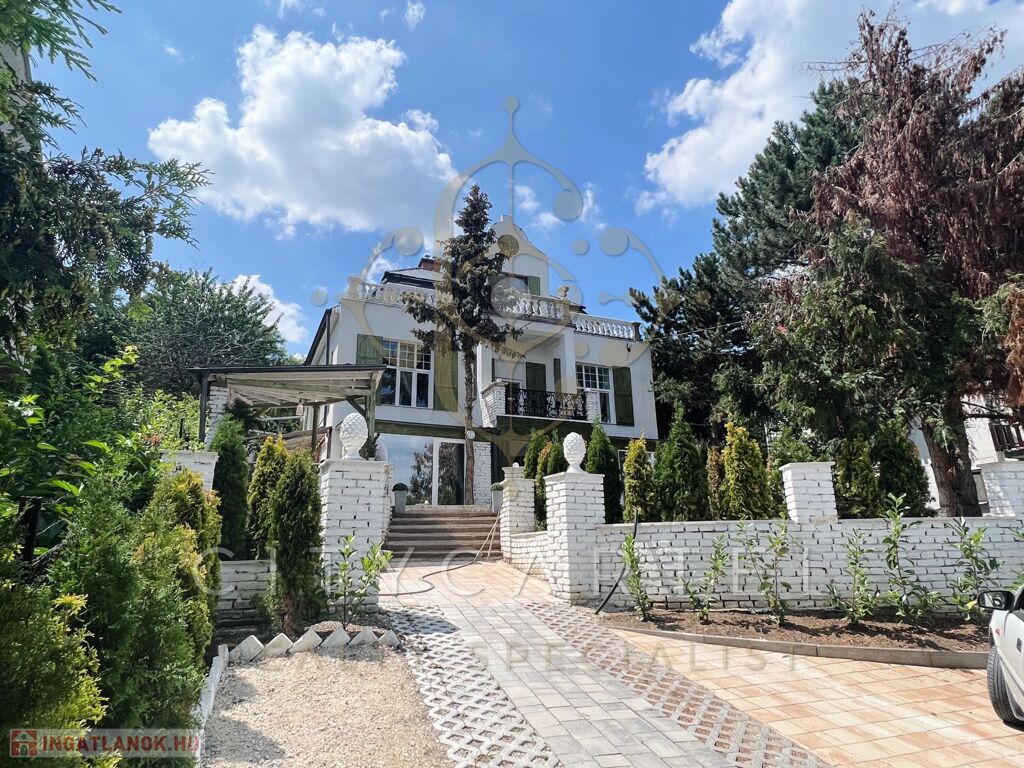 Az épület homlokzatán található dekoratív elemek, mint például a felső szinten lévő ívelt díszítések, hozzájárulnak a villa egyedi megjelenéséhez és emelik az ingatlan exkluzivitását.
