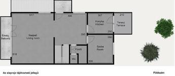 A földszinten találunk egy központi étkezőt, egy tágas, utcai irányba tekintő, erkélykapcsolatos nappalit, egy hátsó kertre néző szobát, egy kertkapcsolatos konyhát, és egy zuhanyzóval és szeparált wc-vel rendelkező fürdőszobát.