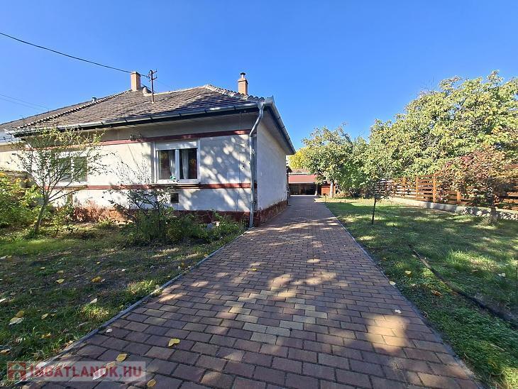 Az ingatlan egy 742 m²-es, rendezett telken helyezkedik el, ahol autóbeállási lehetőség biztosított, a kert végében pedig egy fedett beálló két autó részére is helyet kapott.