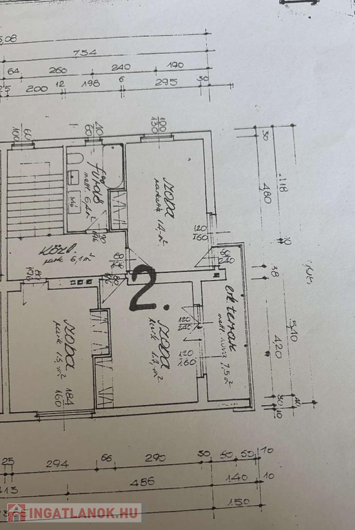Emelet: 3 szoba, zuhanyzós + kádas fürdőszoba, közlekedő.