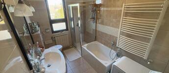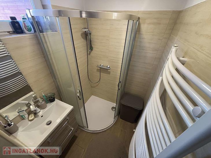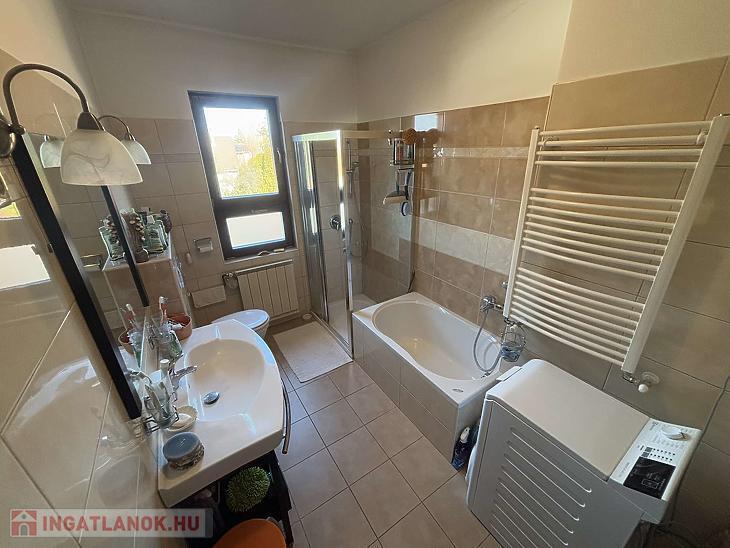 Emelet: 3 szoba, zuhanyzós + kádas fürdőszoba, közlekedő.