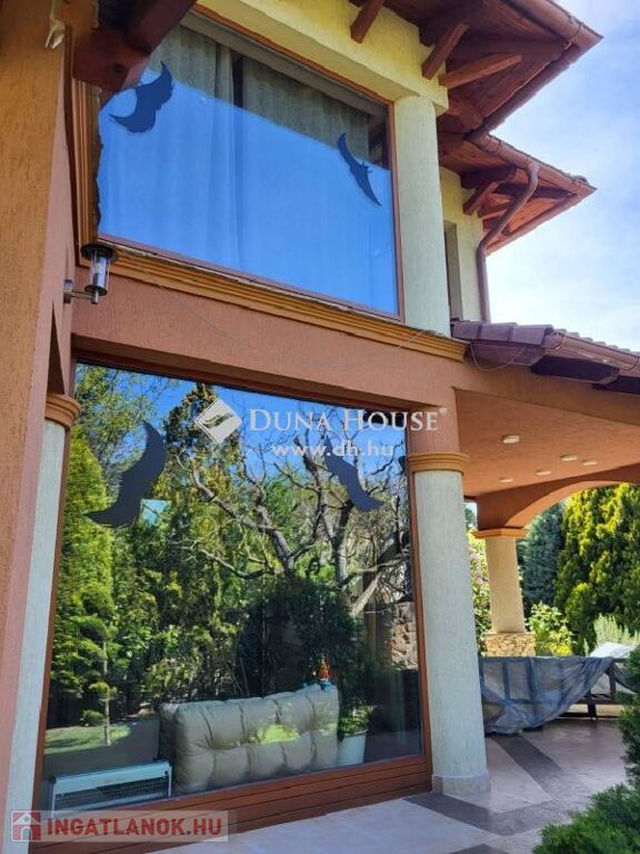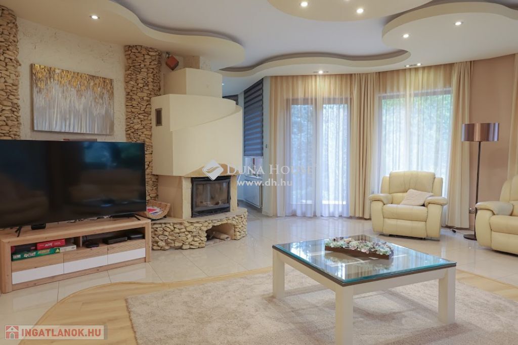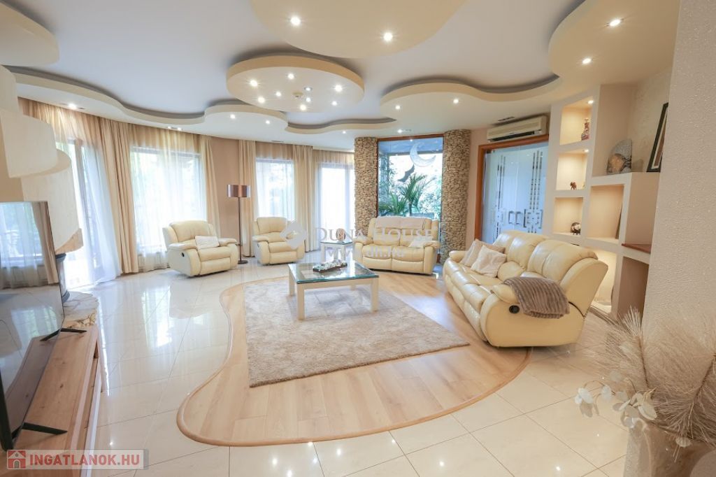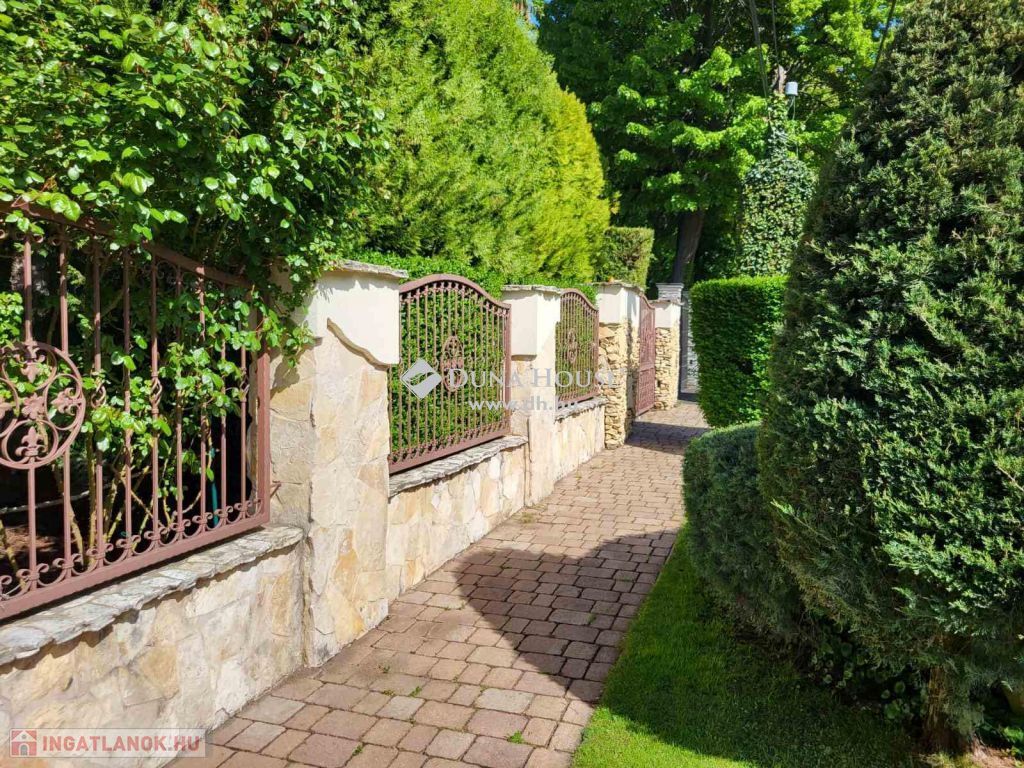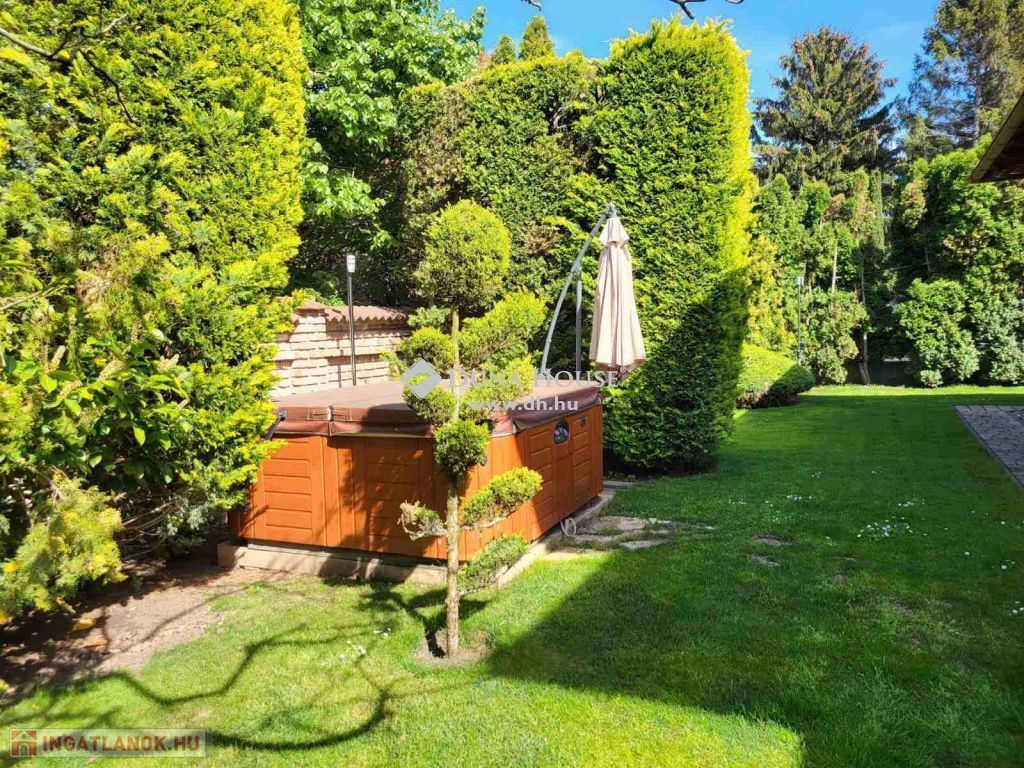 Kert jellemzői: Egyedi növények, örökzöldek , sziklakert, 2,5 méter mély kerti tó található. Bontott téglából 2,70 m magas kerítés a ház körül. Elektromos nagykapu az udvaron 5-6 autó kényelmesen parkolhat, garázsban 2 autó. Sütögető bontott téglából kialakítva, tágas 20 m2-es fedett terasz teszi kényelmessé a pihenést ami az intim kertre néz. Jakuzzi mellett helyet kapott egy tusoló is.