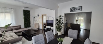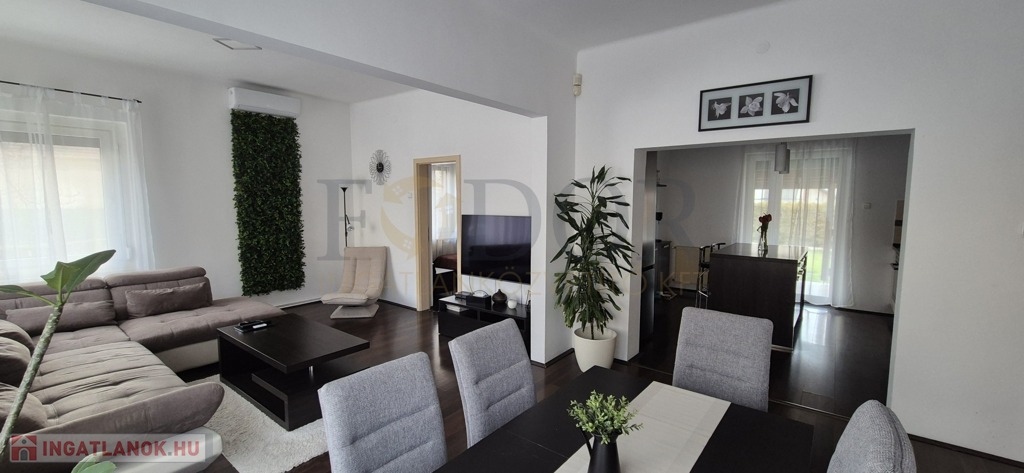 Amikor belépünk, az előszobából egy tágas, világos élettér tárul elénk. A konyha–étkező–nappali együttese a ház igazi szíve – itt zajlanak a hétköznapok reggeli indulásai, a közös vacsorák, az ünnepi pillanatok. A konyhából egy fedett teraszra léphetünk ki, ahonnan a kert látványa fogad – zöld, rendezett, hívogató. A földszinten egy külön szoba, fürdőszoba és kamra is helyet kapott, az emelet pedig két szobát és egy további fürdőt rejt – ideális elrendezés családosok számára. A ház teljes bútorzata a vételár részét képezi, így az otthon eleganciája már az első pillanattól adott.