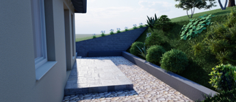 A bejárati ajtó előtt járda az utca frontig viacolor burkolat.