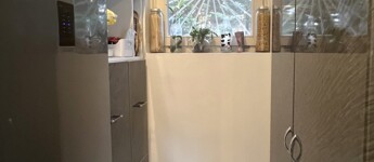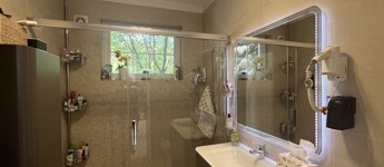 • a nappali előteréből nyíló fürdőszoba egyedi üvegezett zuhanyzótérrel,