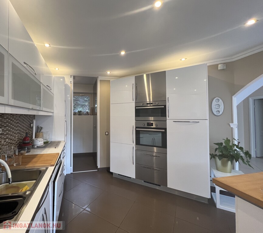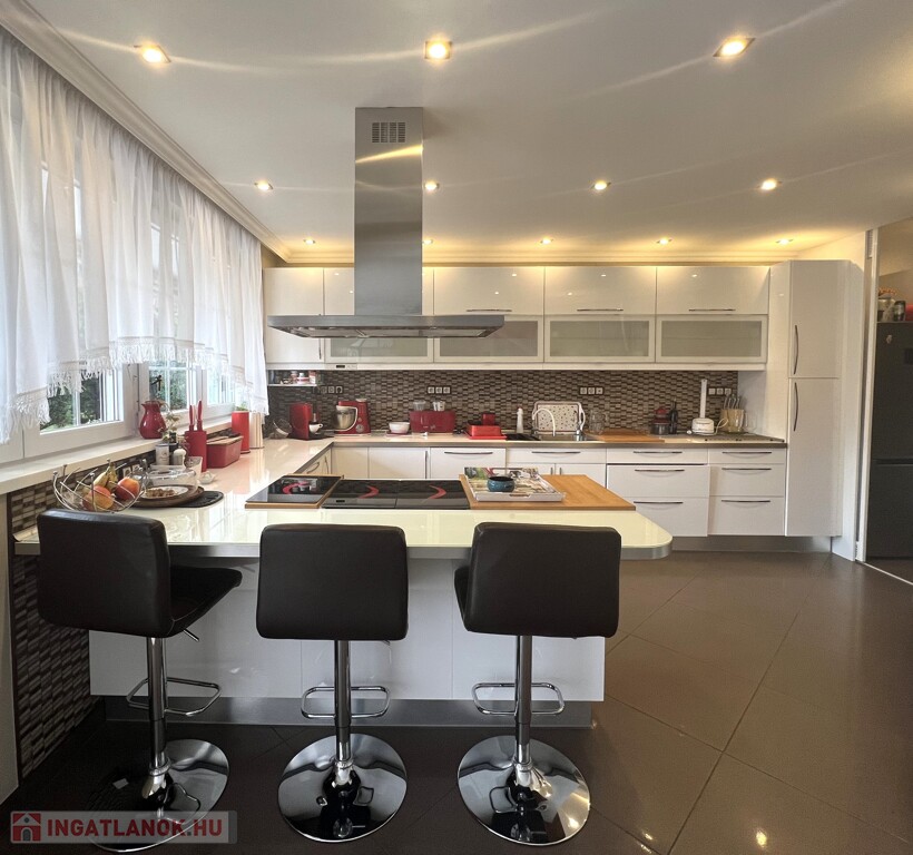 • az étkezőhöz kapcsolódó nagy üvegfelületekkel kerti teraszra néző, NAGYMÉRETŰ BEÉPÍTETT KONYHABÚTORRAL és KONYHAGÉPEKKEL FELSZERELT NAGY KONYHA TERÜLET (15 nm), konyha szigettel nagyteljesítményű páraelszívóval, étkezőpulttal,