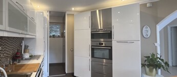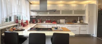 • spacious Kitchen (15 sqm) – connected to the dining area, overlooking the garden terrace through large glass surfaces, equipped with built-in kitchen furniture and appliances, including a kitchen island with a high-performance extractor hood and dining counter.