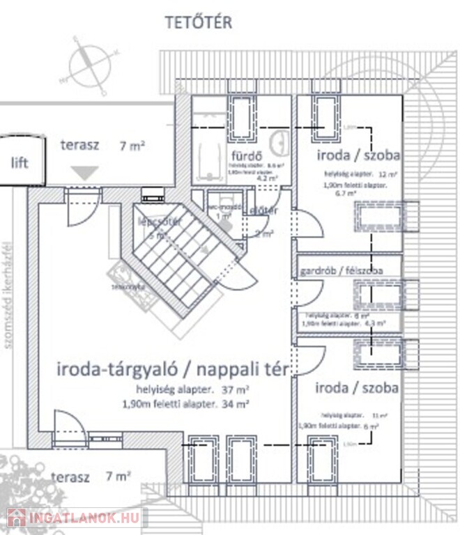 • külső lifttel elérhető teraszról és belső lépcsőházi térből nyílóan akár ÖNÁLLÓ SZINT: jelenlegi iroda vagy akár önálló lakás hasznosításra,