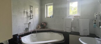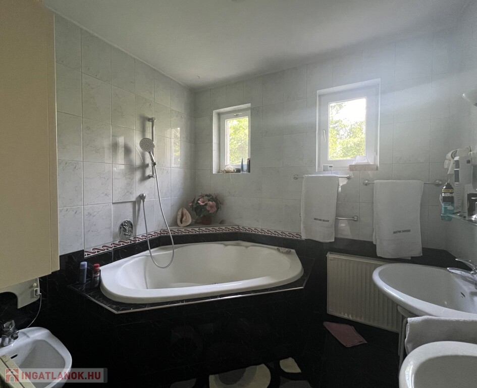 • tágas ablakos sarokkádas bidet-vel is felszerelt tágas fürdőszoba (kb. 6,5nm),