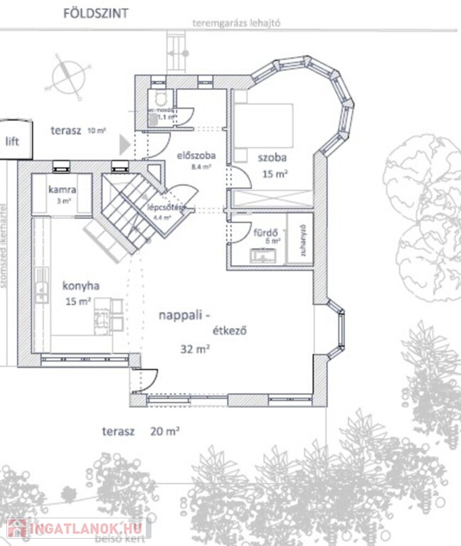 • nagyterű NAPPALI (kb. 45nm), plusz az alsószinti terasz fölé nyúló kertre néző TERASZ (kb. 7nm),