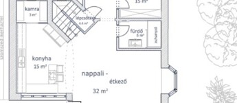 • nagyterű NAPPALI (teljes alapterület kb. 37nm) kis beépített teakonyha szekrénnyel, plusz az alsószinti terasz fölé nyúló kertre néző TERASZ (kb. 7nm),