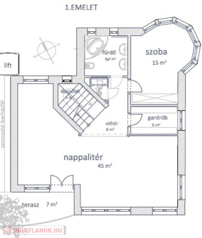 • az előtérből nyíló a földszintihez hasonló íves üvegfelülettel megvilágított HÁLÓSZOBA (kb. 15nm), plusz járó GARDRÓB ablak megvilágítással,