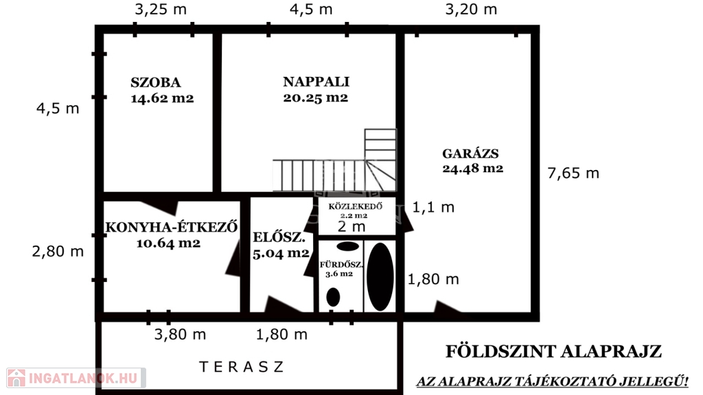 Az ingatlan jelenlegi teljes alapterülete a földszinten 80,83 m² ( garázzsal együtt), ebből a nettó hasznos lakóterület 56,35 m² + a terasz (1/2 része) 10 m² azaz összesen 66,35 m².