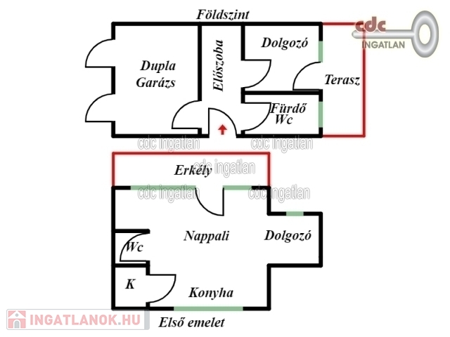 - A földszinten egy dupla garázs, dolgozó szoba és egy tusolós wc található.