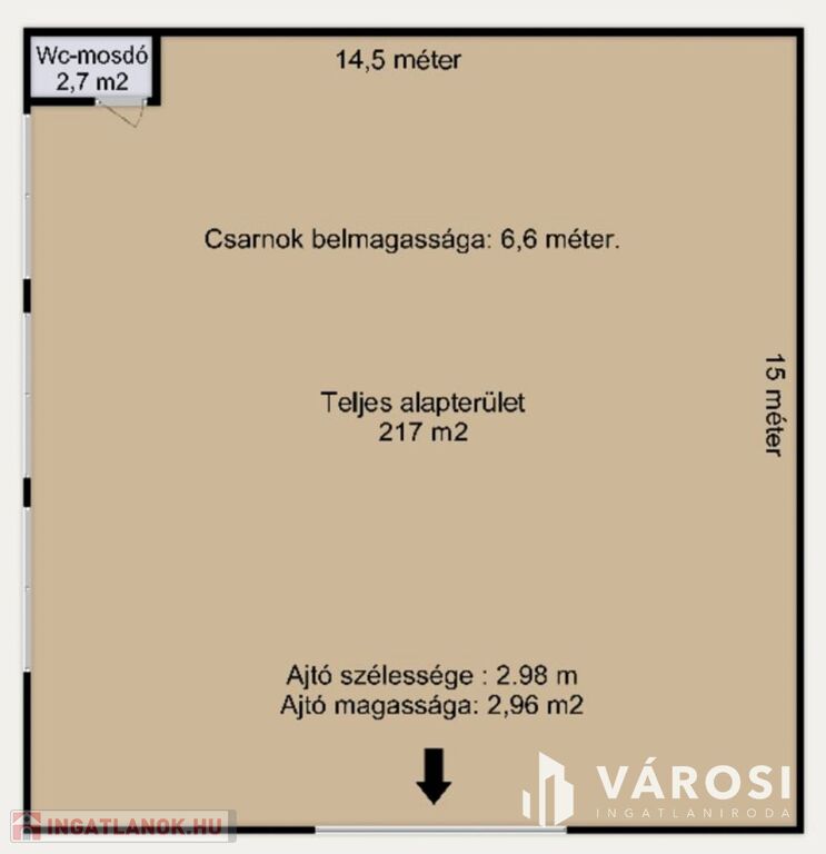 The ceiling height is 6.6 metres. The electric entrance gate is 2.98 metres wide and opens to 2.96 metres high.
