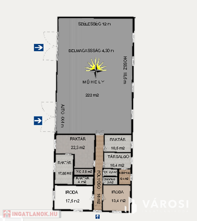 Az ingatlan több helyiségből áll, ami az alaprajzon látható. Egyrésze hasznosítható irodáknak, ehhez tartozik konyha, étkező, mosdók, külön férfi-női mosdó, a műhely részleg pedig jármű szerelésre vagy raktározásra alkalmas. Kamion is befér az ajtón 4x4 m-es.