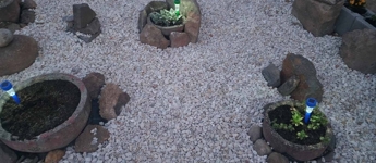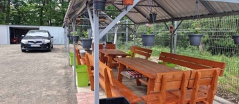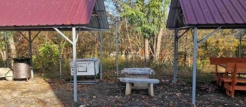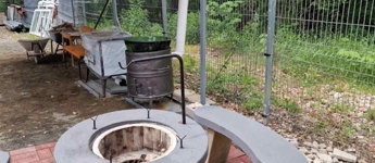A telken 3 db különálló új fémgarázs, ízlésesen kialakított kiülők, szalonnasütő, kis sziklakert és medence beton alap is található.