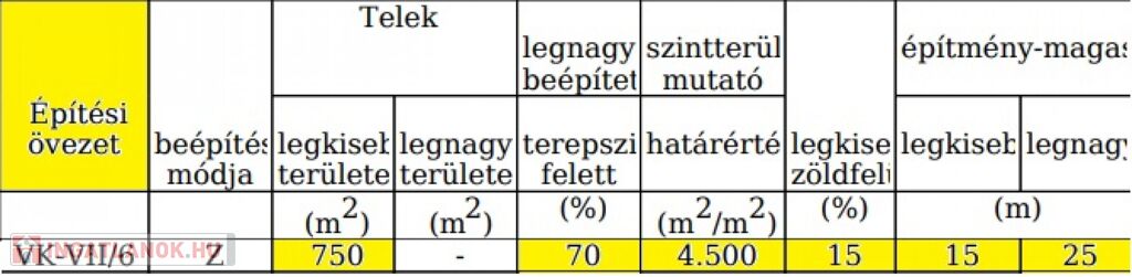 Beépíthetőség: 80%, Minimum zöldterület mértéke 15%.