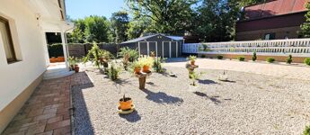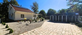 A rendezett kertben egy 30 m²-es dupla lemezgarázs, valamint egy 8 m²-es tároló is található. A garázs előtti térkövezett udvar kényelmes parkolási lehetőséget biztosít, az ingatlan biztonságáról pedig kamerarendszer gondoskodik.
