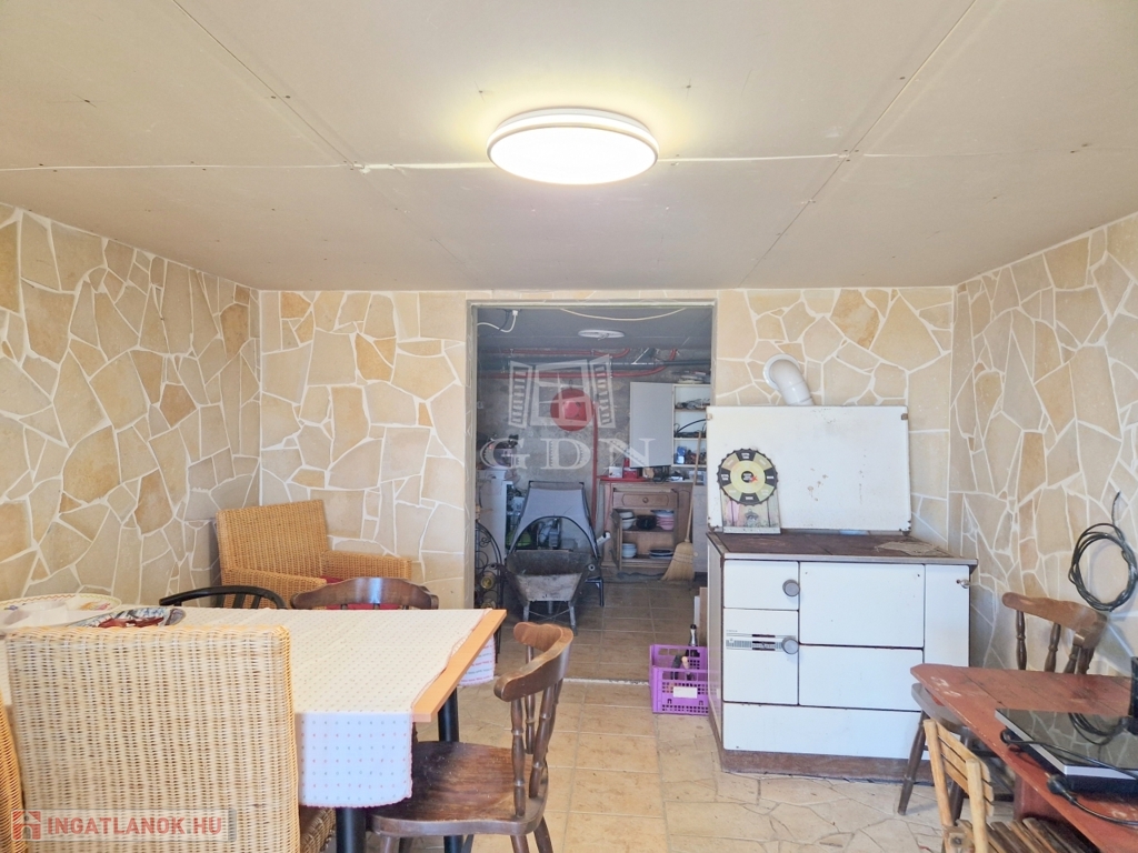 Az alsó szinten találjuk a konyha- étkezőt, valamint a jelenleg tárolásra használt pincerészt, továbbá egy külön bejáratú fatároló is rendelkezésünkre áll.