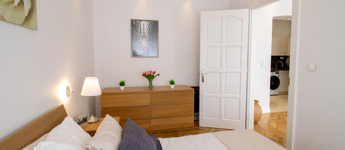 A nappaliból jutunk át a kellemes méretű, elegánsan bútorozott hálószobába.