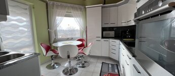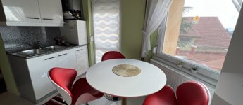 A központi konyha-étkező napfényes és tágas, innen közvetlenül elérhető a délnyugati tájolású, panorámás erkély.