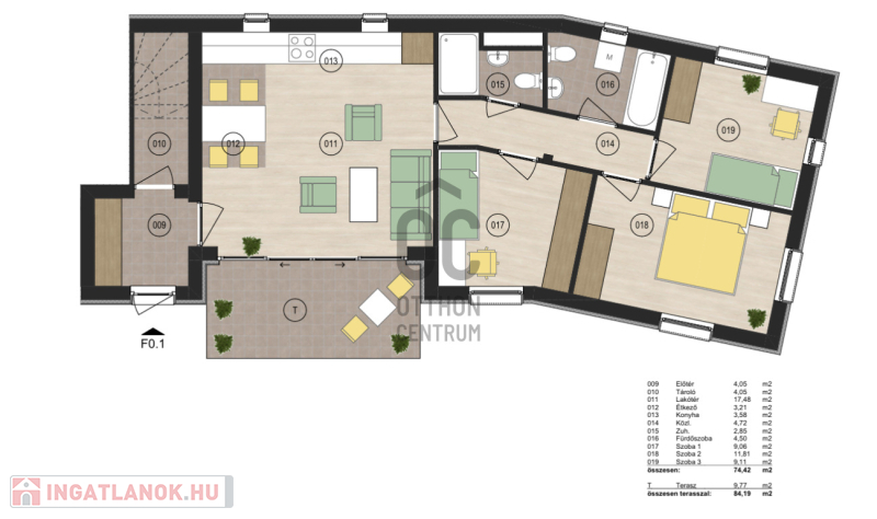 Földszinten : 1 db lakás ( 74,42 m2 ) + teraszkapcsolattal ( 9,77 m2 ) , 5 db gépkocsitároló és 5 db tároló