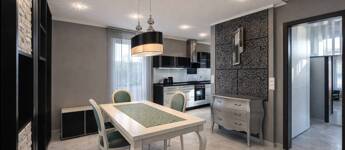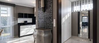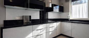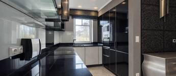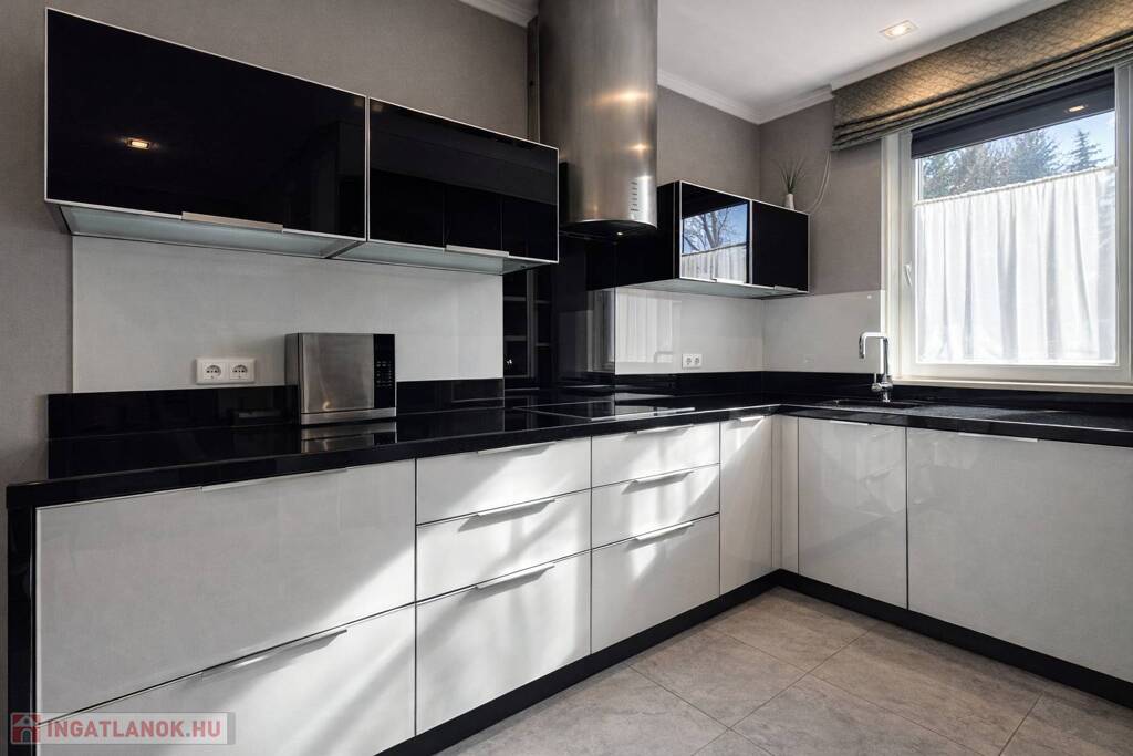 - Egyedi olasz konyhabútor üveg frontlapokkal, fekete gránit pulttal, beépített háztartási gépekkel