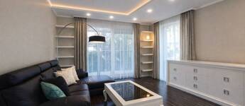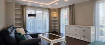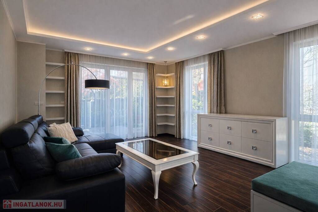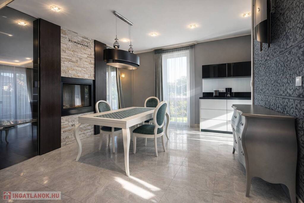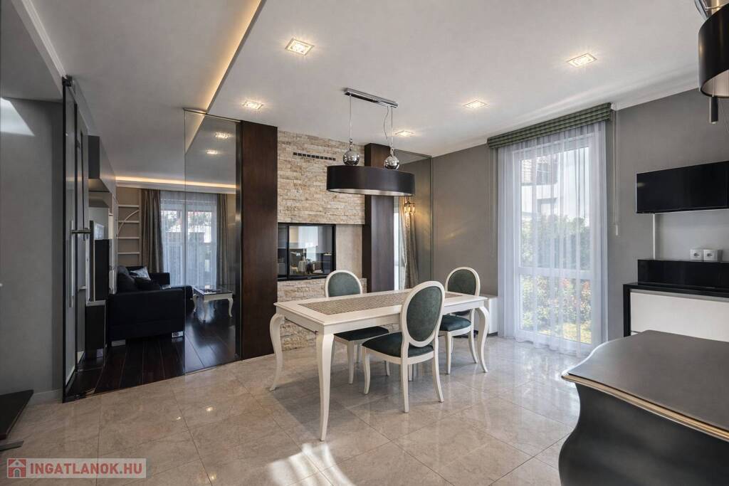 A lakberendező által megálmodott enteriőrben az olasz és spanyol bútorok, az egyedi beépített megoldások, a látványkandalló és az üvegfalak különleges, mégis harmonikus atmoszférát teremtenek. A nappaliból és az étkezőből közvetlen kapcsolat nyílik a térkővel burkolt teraszra és a parkosított, öntözőrendszerrel kiépített, kb. 80 m²-es, intim udvarra – tökéletes helyszín nyugodt, privát kikapcsolódáshoz