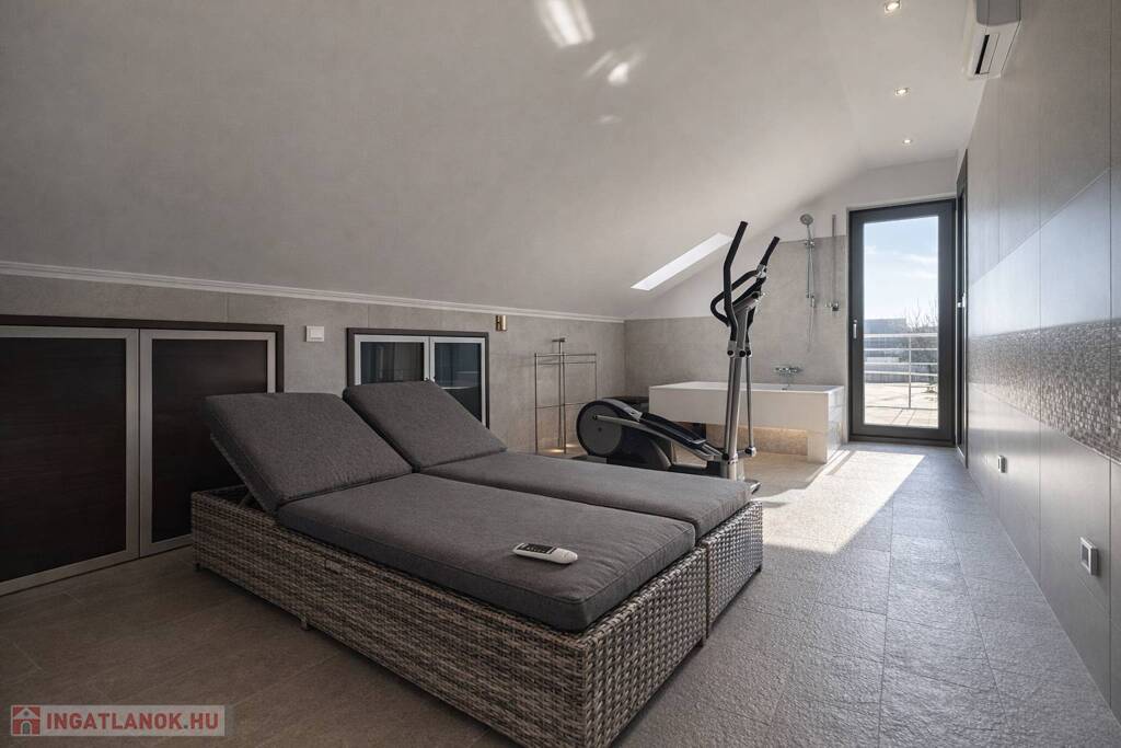 A tetőtéri wellness-szint saját szaunával és merülőkáddal a mindennapi feltöltődést szolgálja, miközben igény esetén önálló lakószintté is alakítható