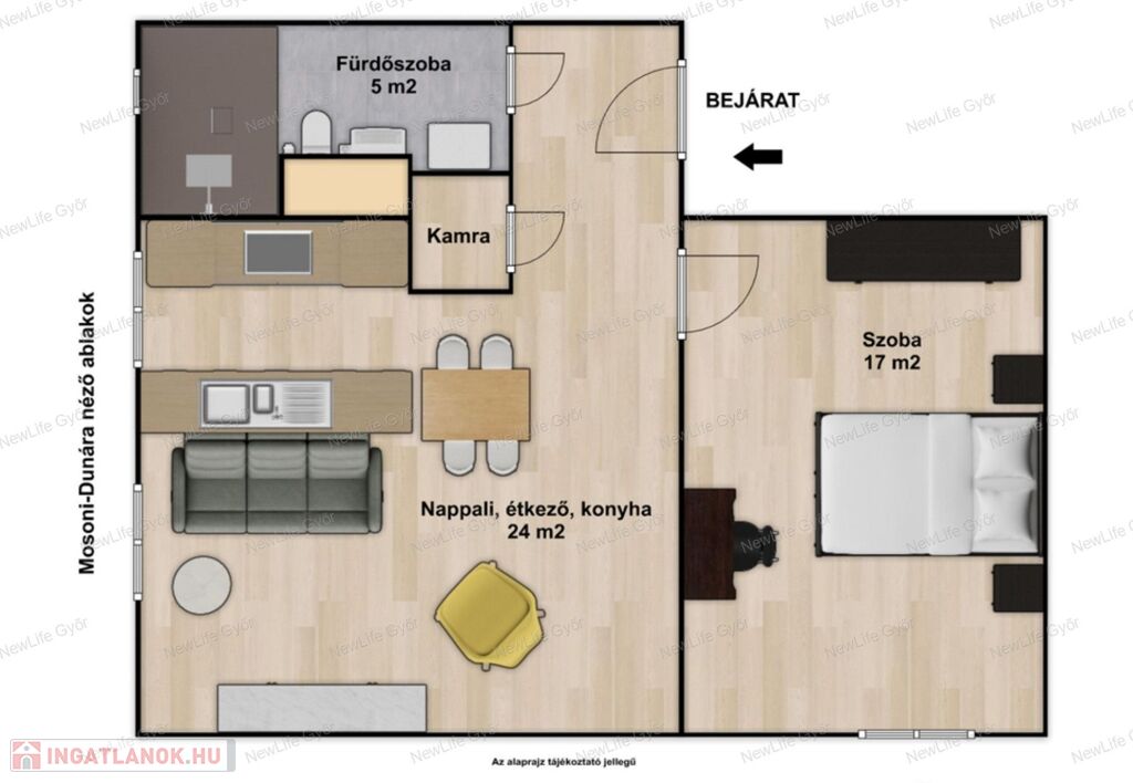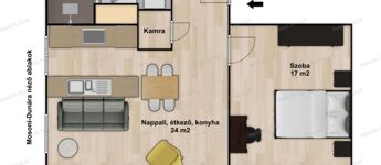 Elosztása: előszoba, amerikai konyhás nappali étkezővel, kamra, fürdőszoba zuhanyzóval, és WC-vel, egy valóban tágas hálószobal.