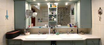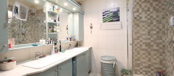 A fürdőben dupla mosdó, zuhanykabin.