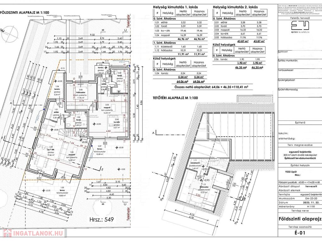 Tetőtér: 10,31 m2 háló, 1,6 m2 közlekedő.