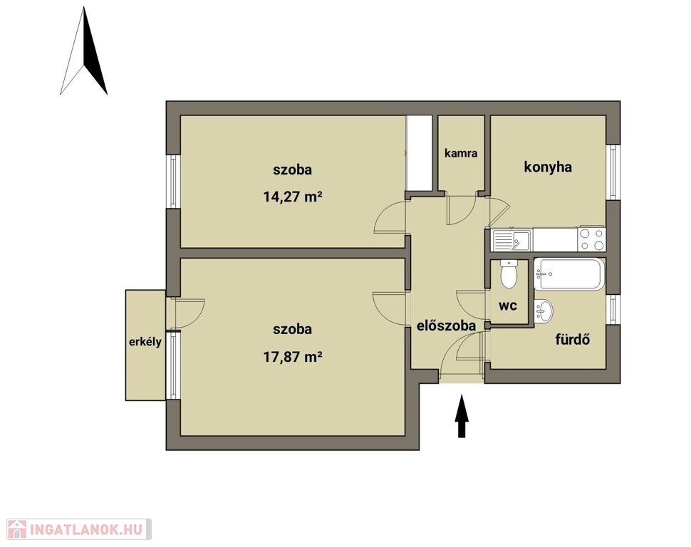 Helyiséglista: 2 szoba, konyha-étkező, kamra, fürdőszoba, WC, előszoba, erkély, pince