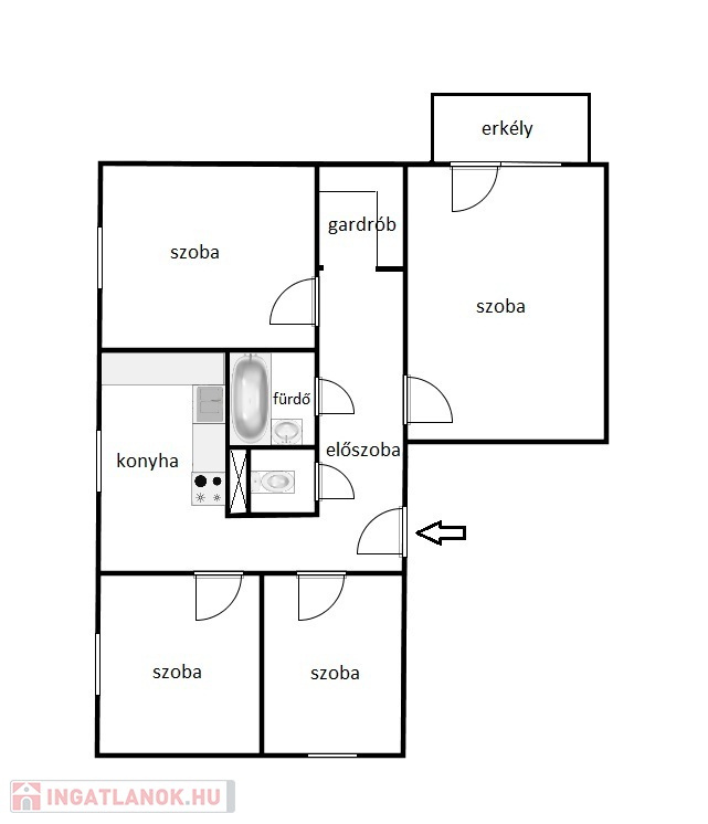 4 szoba, konyha, fürdőszoba, WC, előszoba, gardrób, erkély, pince