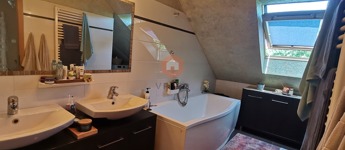 Egyedileg díszített emeleti fürdőszoba, káddal, WC-vel, az alsó szinten külön WC, tároló szoba a lépcső alatt.
