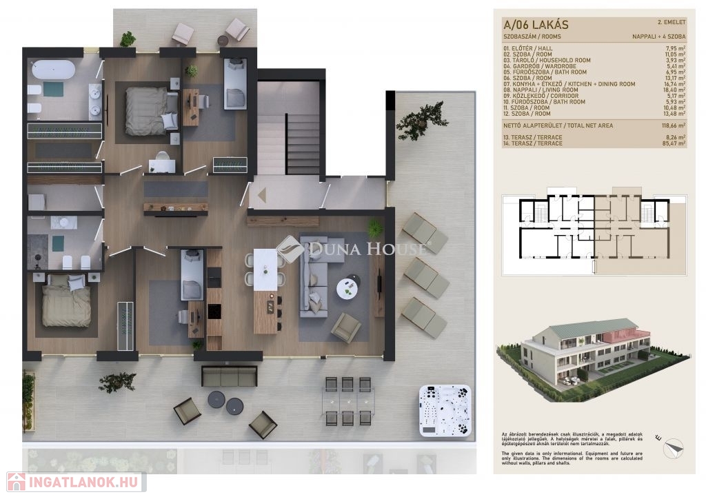 Az ingatlanban 48-119 nm közötti méretekben, a 1 szoba+nappalistól a 4 háló+nappalis elosztásig választhatunk, mindegyik lakáshoz saját tágas terasz is tartozik. A 2. emeleten 70 nm-es terasszal rendelkező PENTHOUSE LAKÁSOK kerülnek kialakításra, melyek igény szerint megoszthatók. A lakások minőségi burkolatai-szaniterei jelenleg egyedi igények szerint válaszhatók! Lehetőség van 22db teremgarázshely megvásárlására is nettó 8 M Ft/db áron!