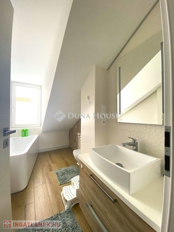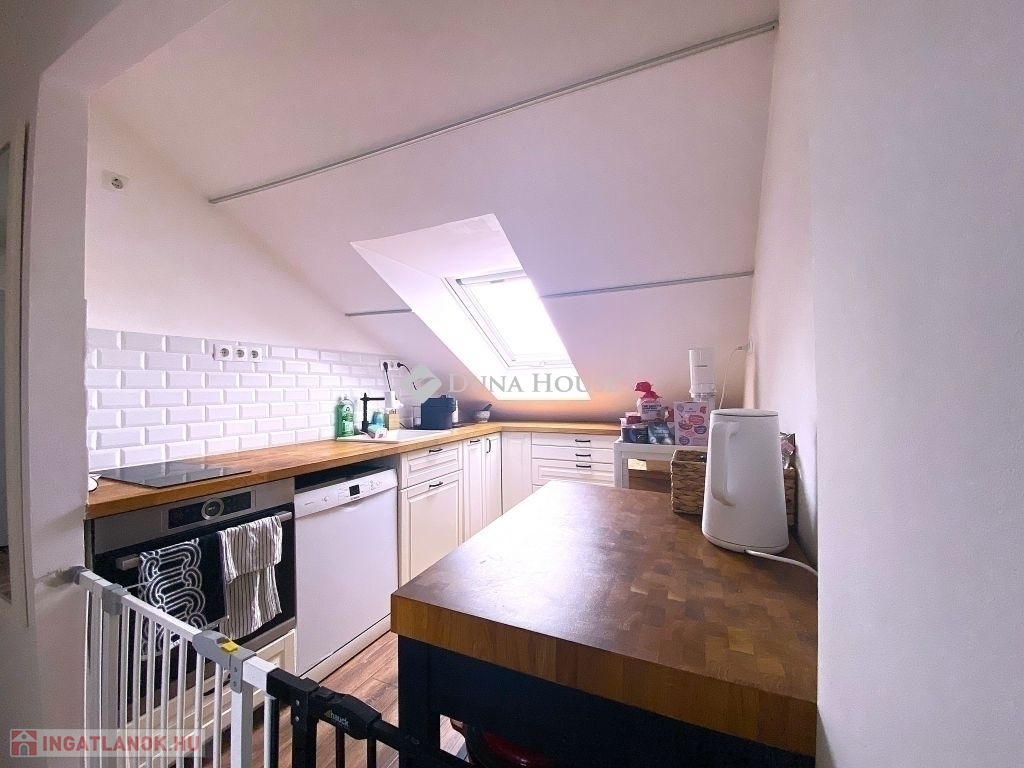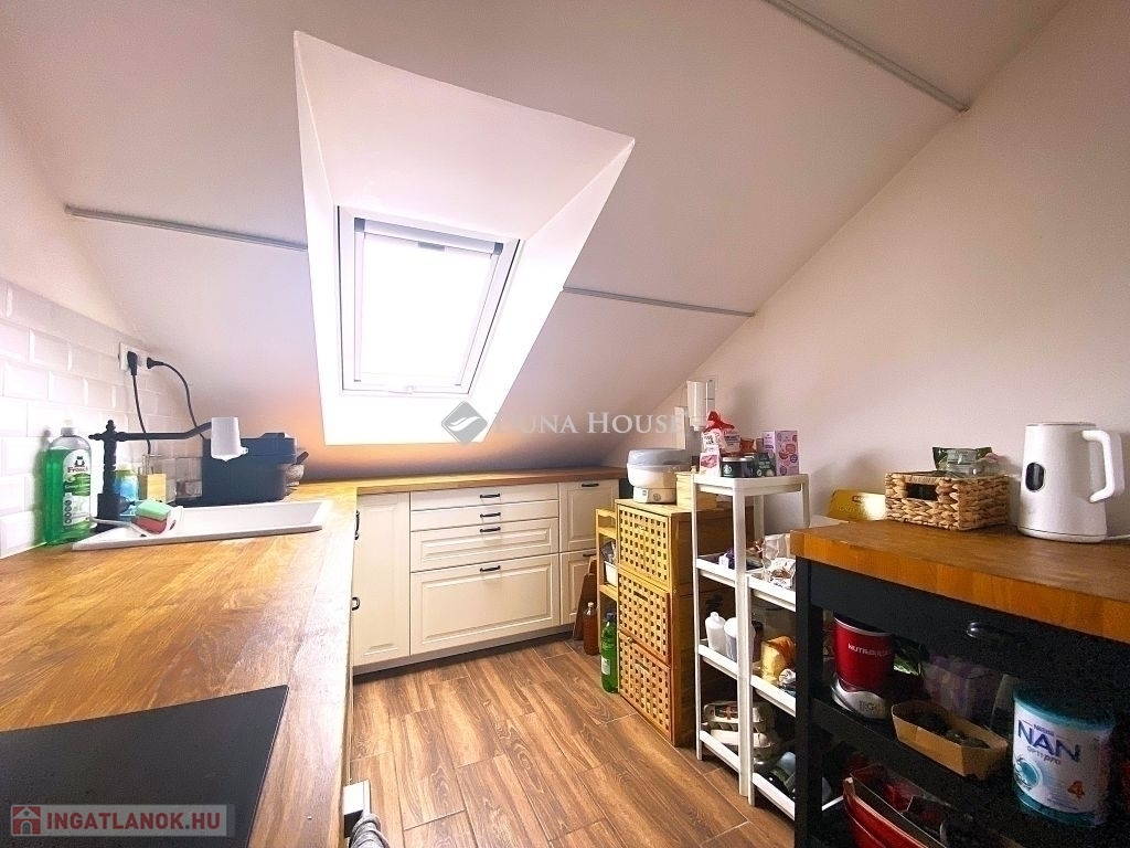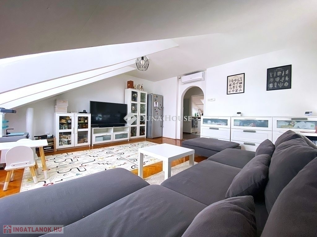 Pécsen, a közkedvelt Bánki Donát utcában eladó egy kiváló adottságokkal rendelkező tetőtéri téglalakás!A lakás bruttó 80 m²-es, nettó 50 m², míg a hasznos alapterülete 65 m², elosztása pedig rendkívül praktikus és élhető. A jól átgondolt alaprajznak köszönhetően 2 külön nyíló szoba és tágas nappali biztosítja a kényelmes életteret.A folyosóról nyílik egy kis háztartási helyiség, ahol a mosógép és szárítógép kényelmesen (hangszigetelten) elfér.Az ingatlan jó lokációban, gyerekbarát környezetben helyezkedik el, csendes, mégis jól megközelíthető környéken.Műszaki felszereltsége és állapota kiváló:- minőségi bejárati és beltéri ajtók- gáz-cirkó fűtés- a fürdőszobában padlófűtés- klimatizált, így nyáron is komfortosIdeális választás családoknak vagy befektetőknek egyaránt, akik egy jó elrendezésű, igényes otthont keresnek Pécs egyik kedvelt részén.