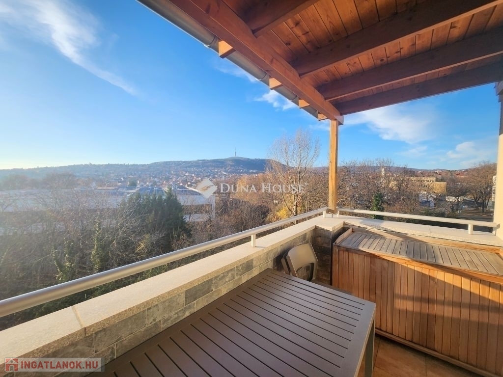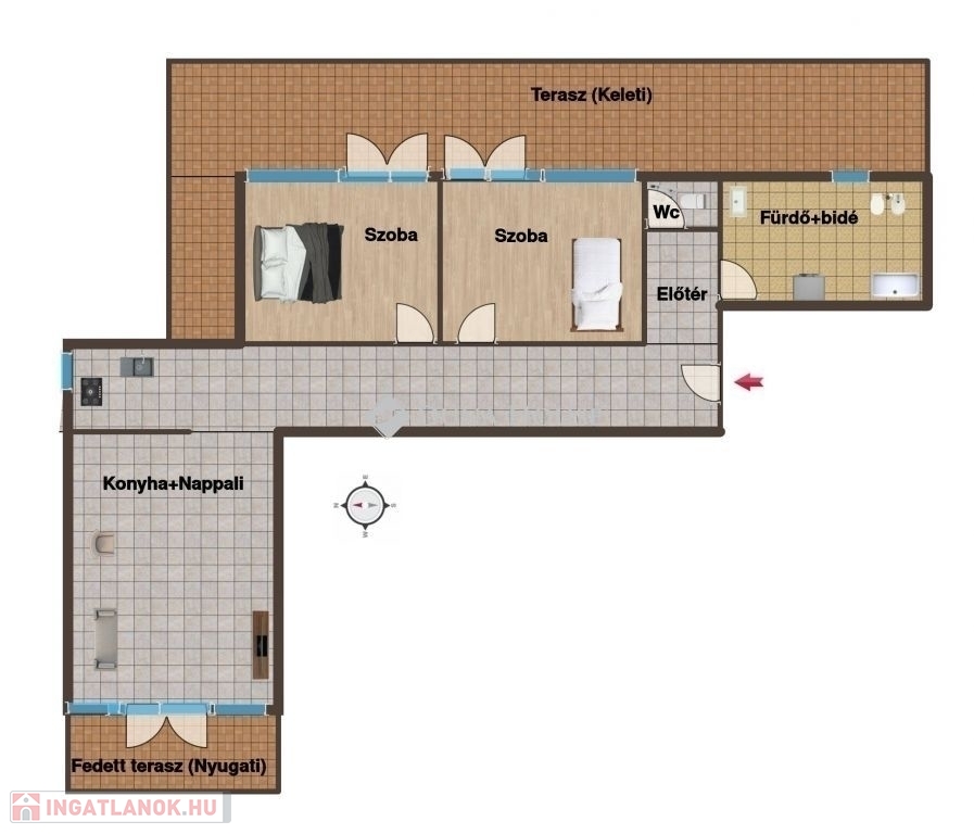 Előtér, 2 külön nyíló szoba, amerikai konyhás nappali, fürdőszoba, külön WC, valamint két fedett terasz, ahonnan gyönyörű panoráma nyílik a TV-toronyra.