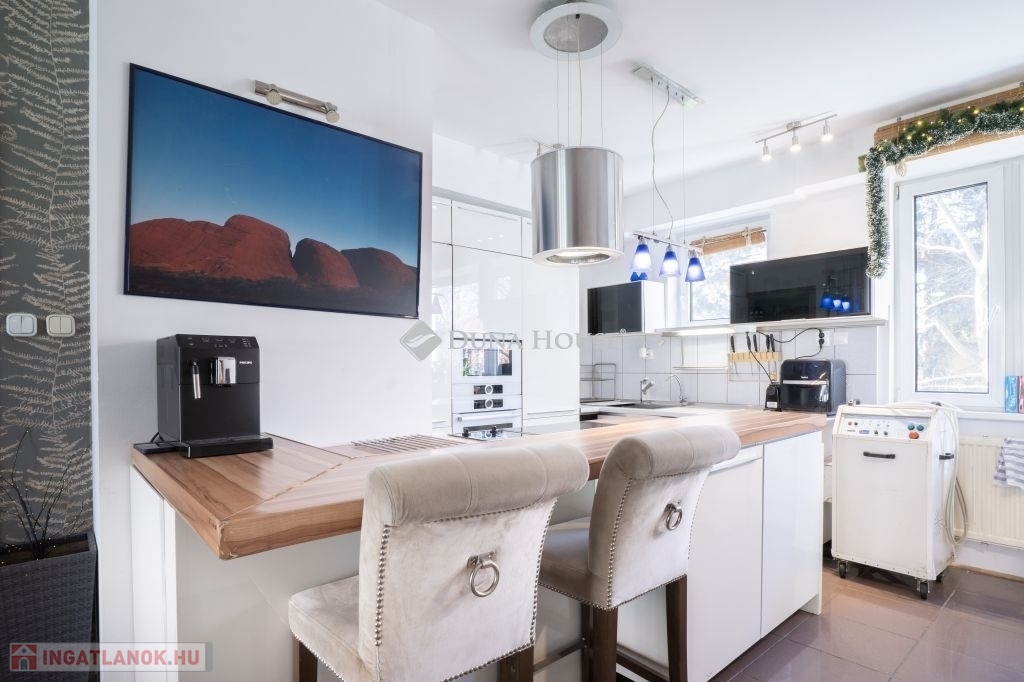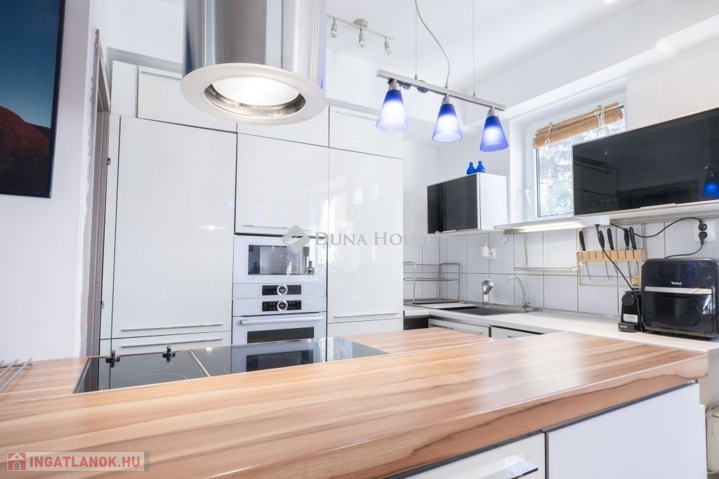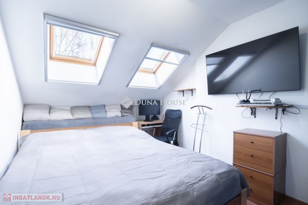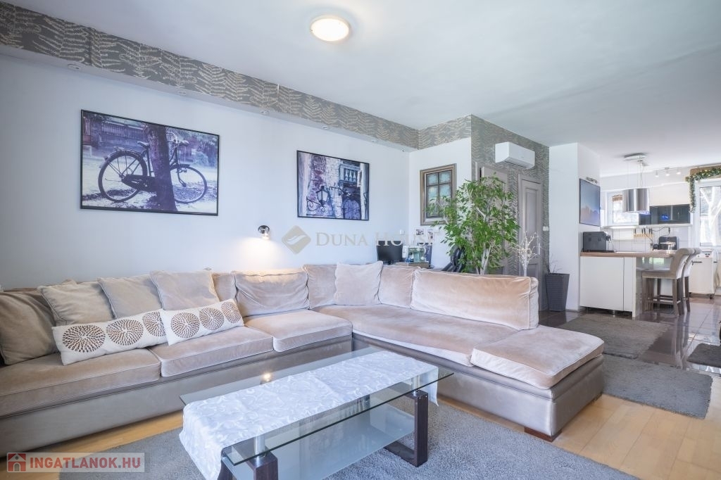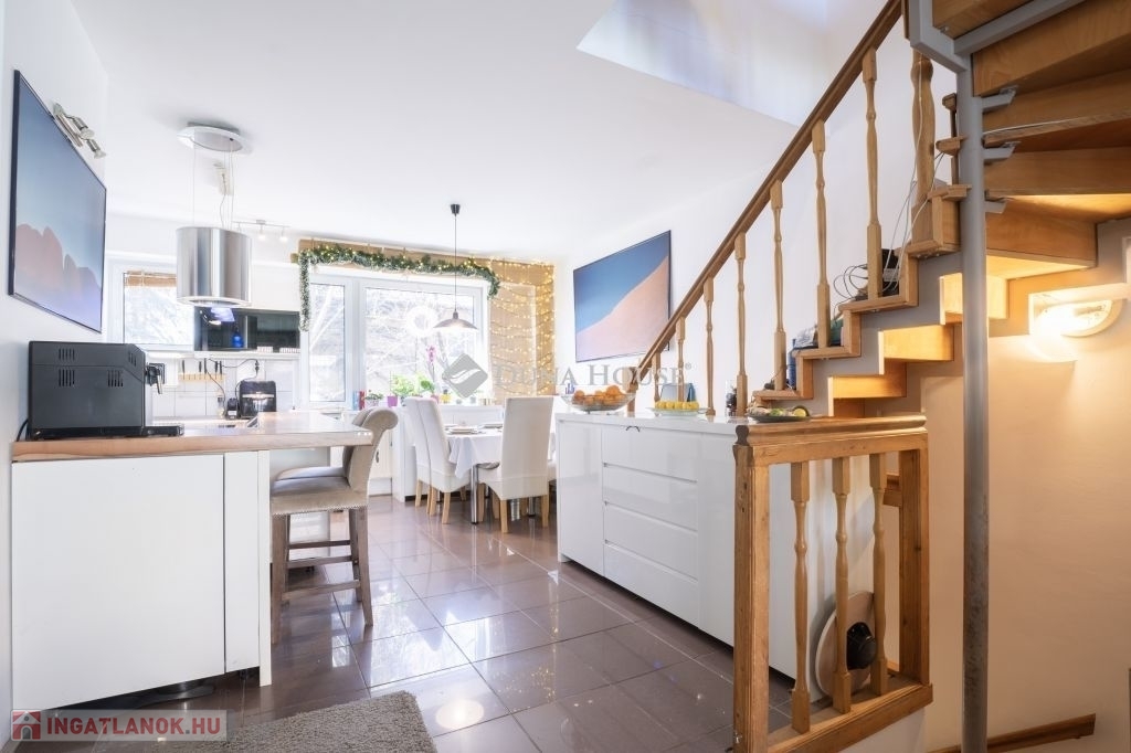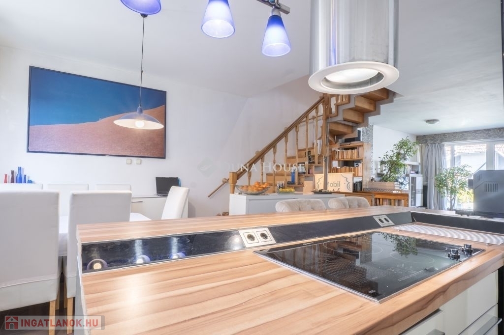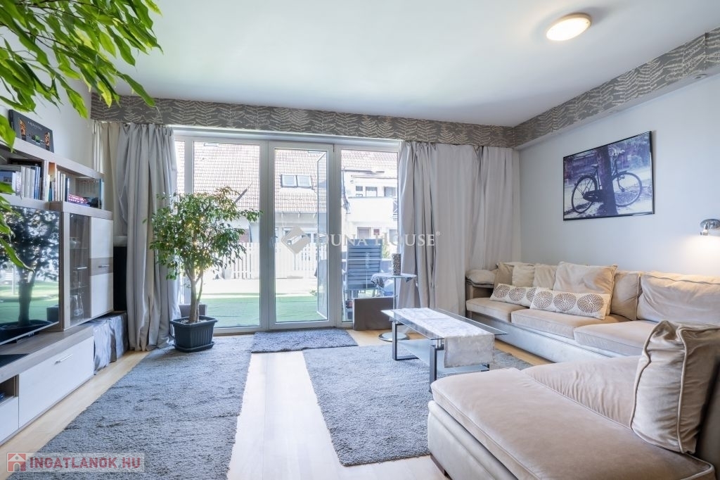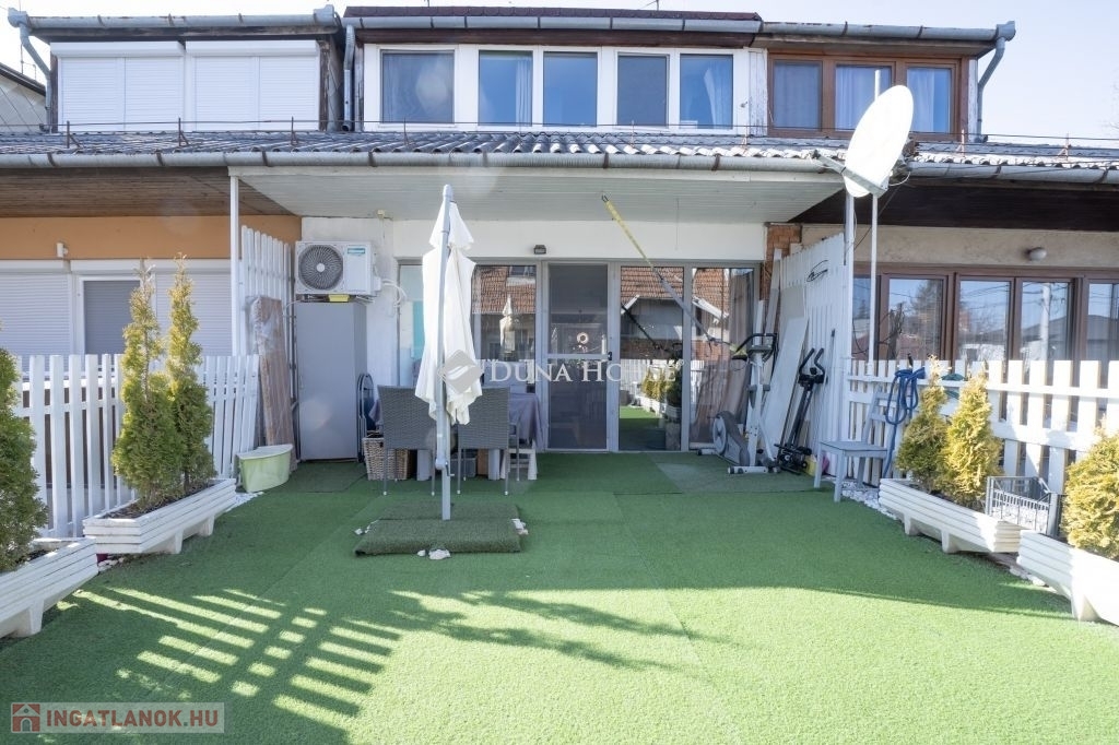 Újszegeden nagy teraszos (42 nm) sorházi lakás eladó!Szeged egyik legkedveltebb városrészében, a belvároshoz közel, mégis parkos, zöldövezeti környezetben vált eladóvá egy 5 lakásos társasház (külön helyrajzi számmal rendelkező) felújított, 105 nm-es, belső kétszintes lakása. Az egymás mellett lévő és külön bejárattal rendelkező lakások az utcafrontra merőlegesen helyezkednek el, egymás mögött, egy közös, beléptető rendszerrel felszerelt kertkapun keresztül közelíthetőek meg, a telek végében pedig a közösen használható kert található, néhány tárolóval.A társasház 1981-2000 között épült, azóta is összetartó, barátságos lakóközösséggel, ahol jó élni.Az ingatlan lakótere az első emeleten kezdődik, ahova, a kerti szintről néhány lépcső vezet fel, egy zárt saját lépcsőházból. A lakás alsó szintje egy légterű, nyitott, ezáltal világos, jól átlátható és szellőztethető. A nappalit és az étkező-konyhát egy közlekedő választja el egymástól, ahova a WC és a kazánház/tároló nyílik, a konyhából pedig egy kis kamrát is leválasztottak. A nappali előtt egy DK- tájolása, nagyméretű nyitott terasz húzódik, mely tavasztól őszig a lakás szerves része, családi-baráti összejövetelek kellemes helyszíne.Az emeleten 3 háló, egy fürdő és egy második szeparált WC kapott helyet. Az egyik háló nem lett leválasztva a közlekedőtől, ezt irodaként/gardróbként használják a jelenlegi lakók, de könnyedén, egy gipszkarton fallal megoldható a 3. háló kialakítása is, ahogy az az eredeti tervrajzon is látható.Az ingatlan fűtéséért gázkazán felel, radiátoros hőleadókkal, de mindkét lakószinten hűtő/fűtő klíma is használható alternatívaként. A jó állapotban lévő nyílászáróknak köszönhetően a rezsi kedvező, a környék infrastuktúrális adottsága kiváló. A közelben pár percen belül elérhető, orvosi rendelő, gyógyszertár, bevásárlási lehetőség, étterem, fodrászat, de a természetbe vágyóknak sem kell messzire menniük, az Erzsébet Liget ill. Holt Maros vízpartja tökéletes a sportolásra, a kikapcsolódásra, a pihenésre.Találja meg itt új otthonát, további információért hívjon bátran, akár hétvégén is!