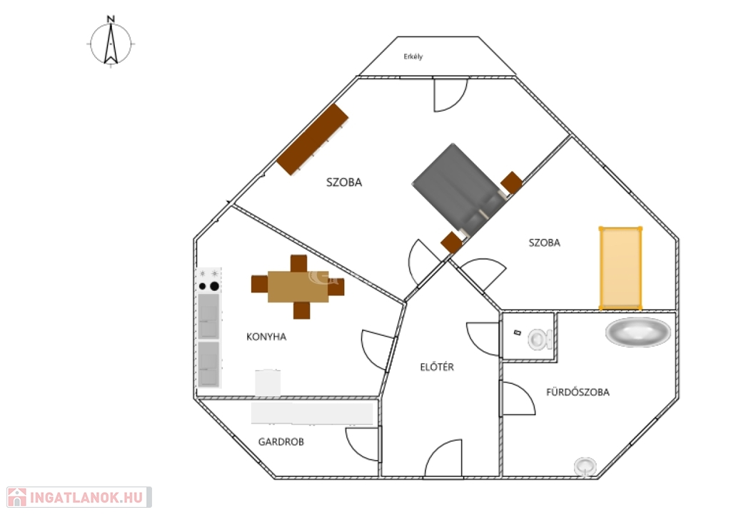 A lakás két szoba, konyha, fürdőszoba, külön wc, erkély, és egy tároló helyiségből áll.