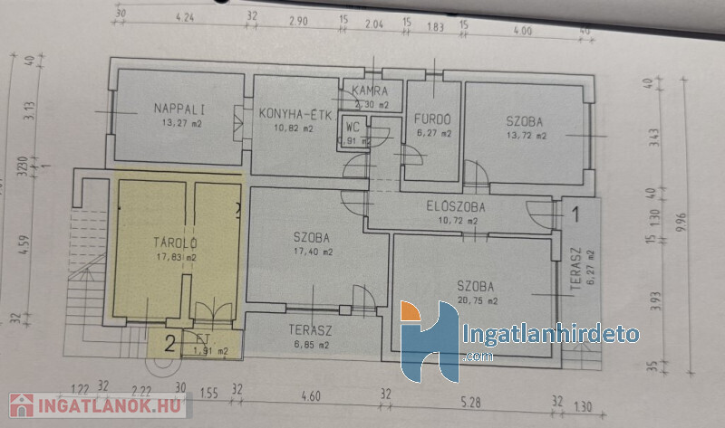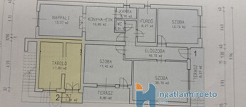 A lakás alapterülete 103 nm, elrendezése 4 szoba, konyha étkezővel, fürdőszoba, WC és kamra.