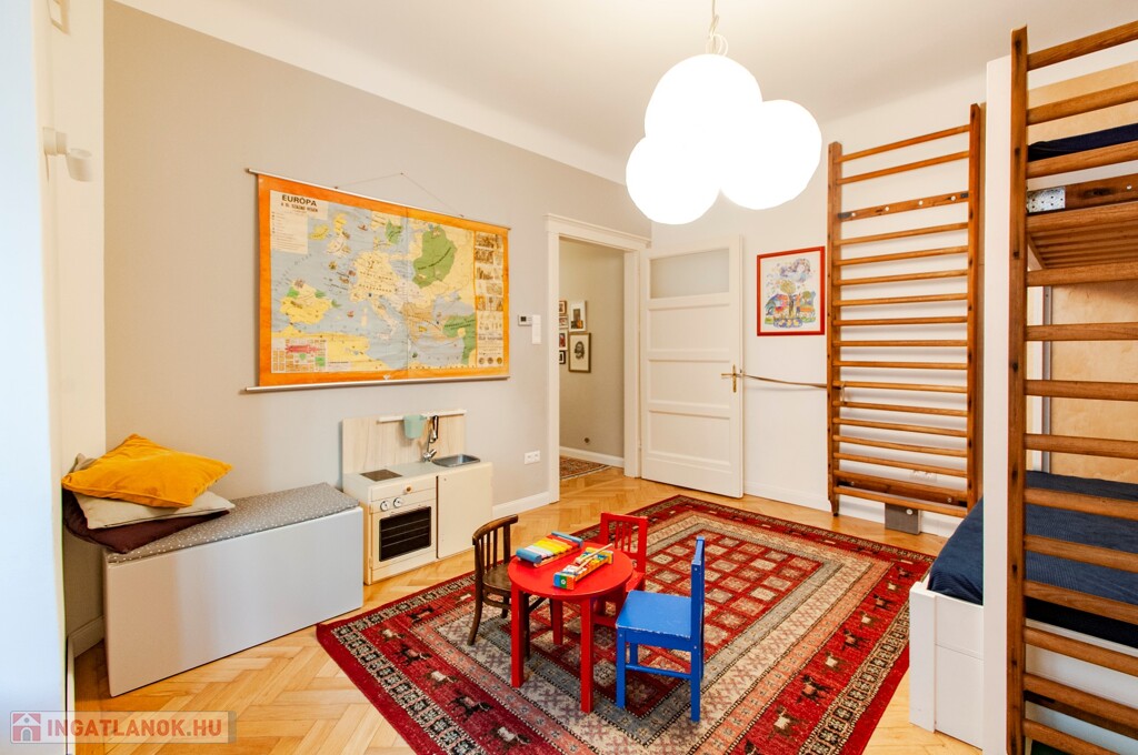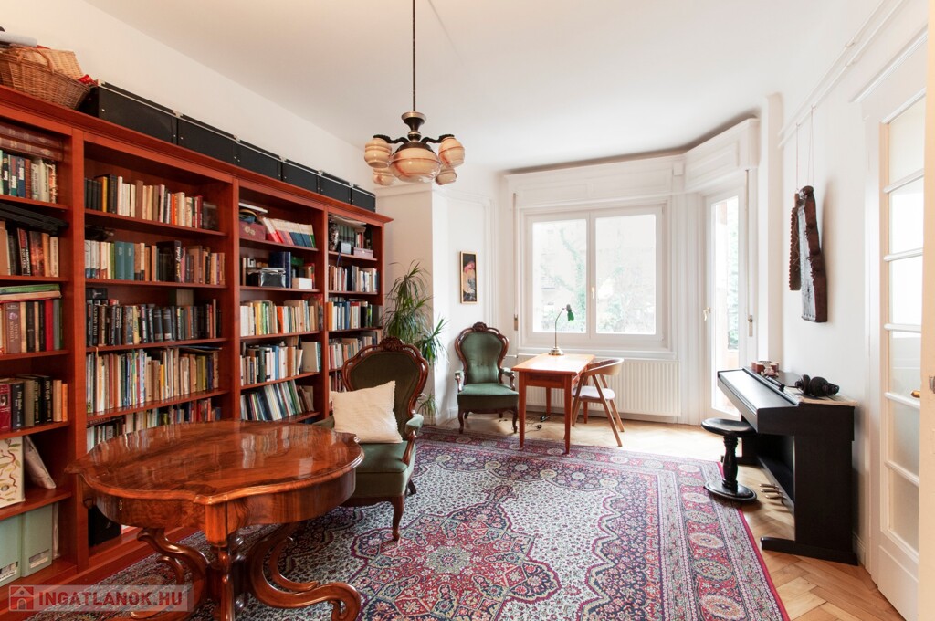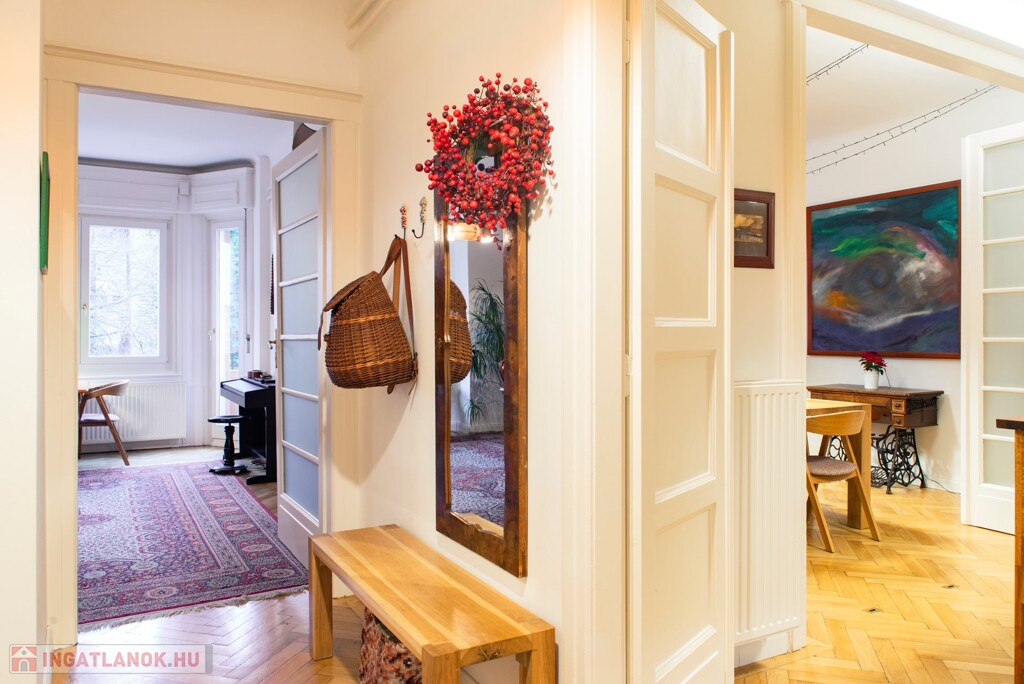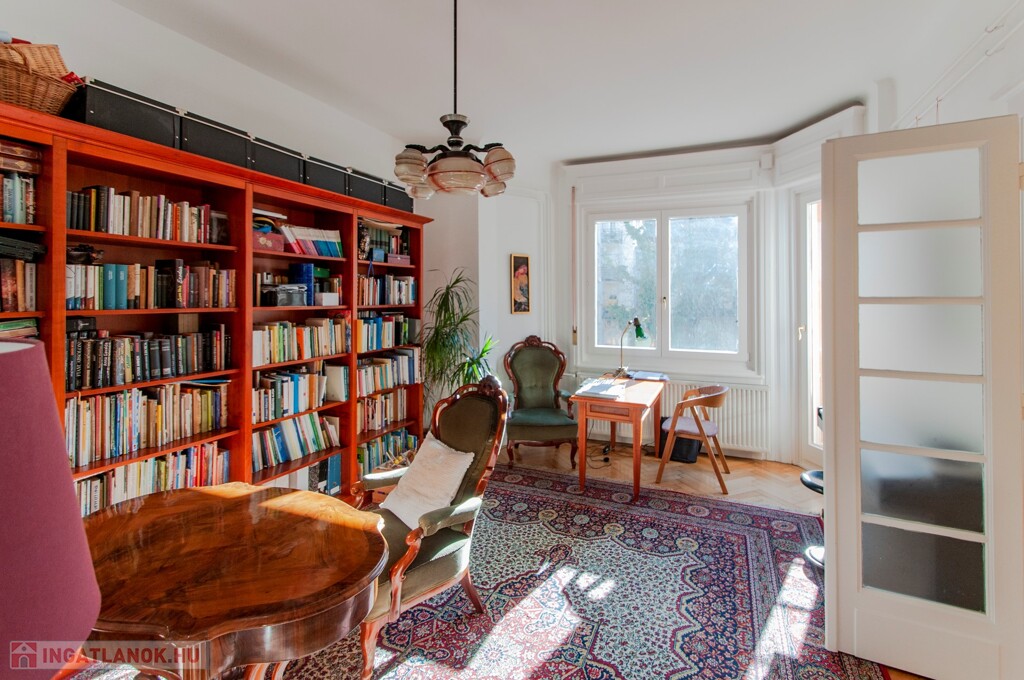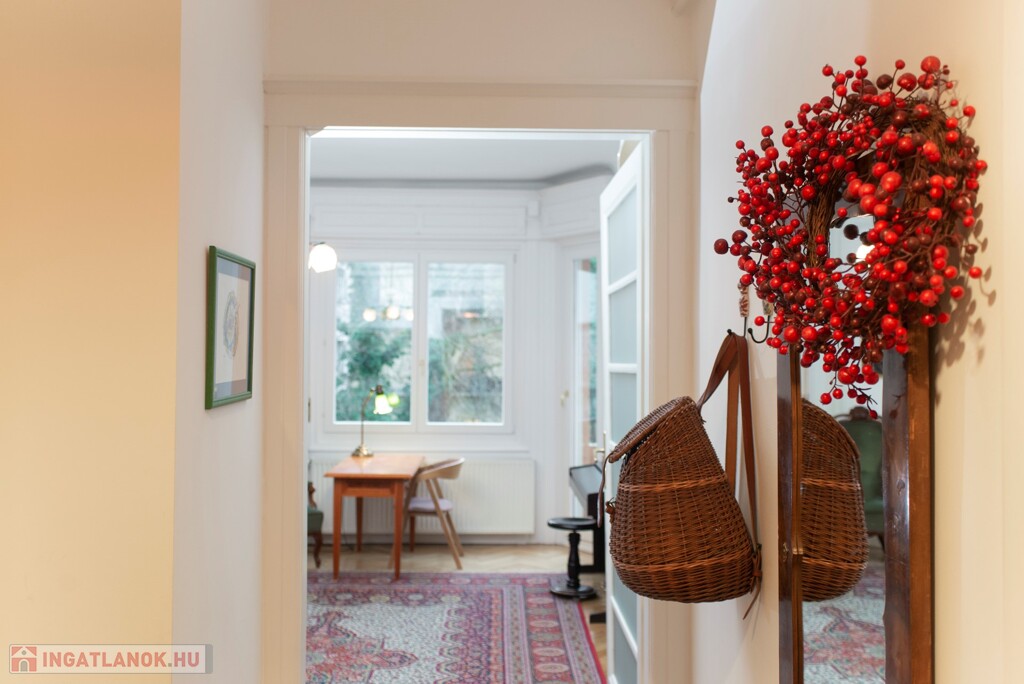 A nappali és az egyik hálószoba az utcára néz, a másik irányban a szobák tágas, zöld és csendes kertre néznek.